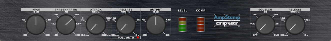 The input signal is first sent through the Compressor which can accomplish several things at once: boost the level of your guitar using the Output control, achieve traditional compression by driving the Input harder and reducing the Threshold/Ratio control, accentuate pick attack by adjusting the Attack and Decay controls, and gate unwanted hum and noise when gain levels are set high by using the Squelch and Release controls.