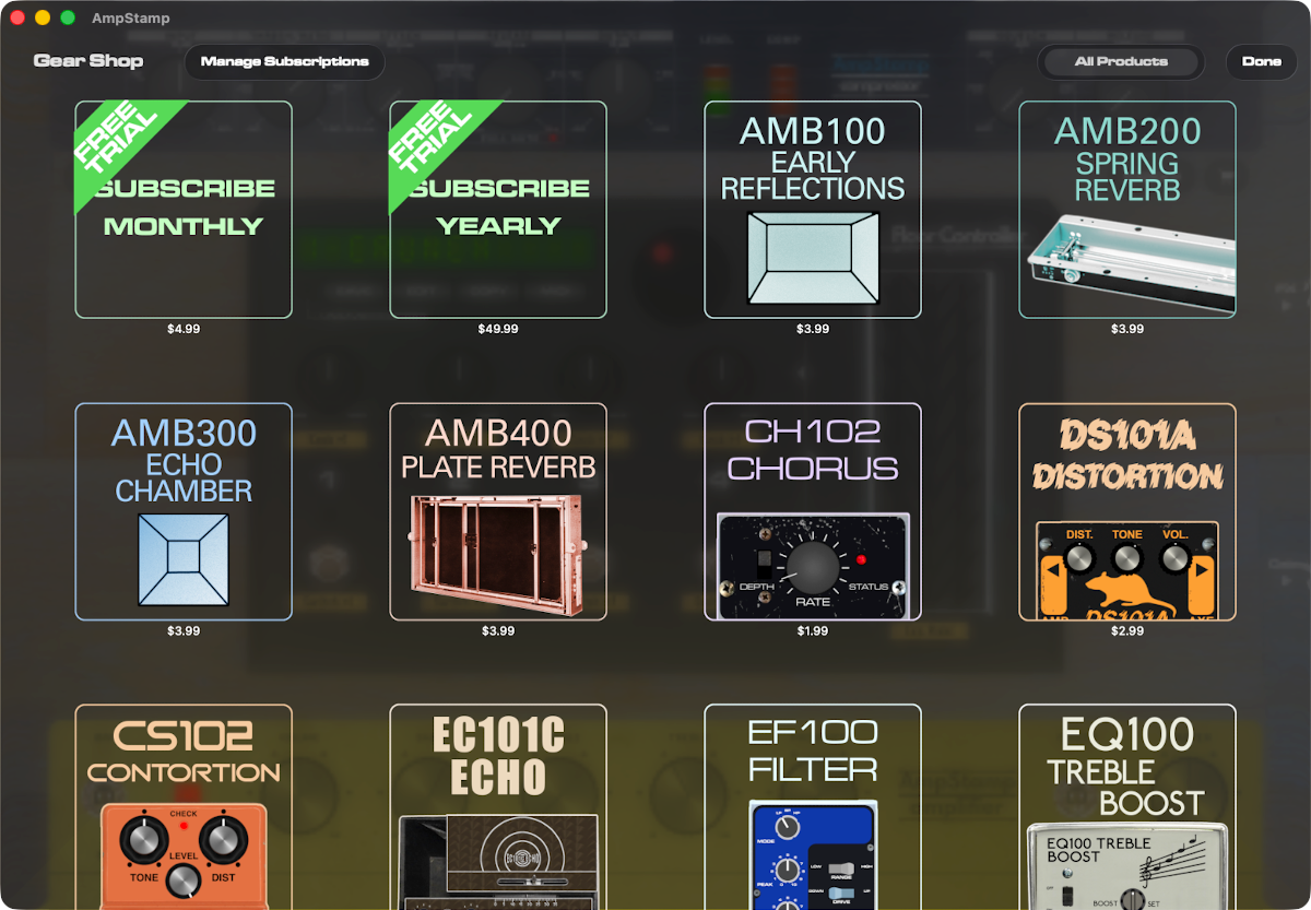 When you need more options or want to expand your creativity, head to the Gear Shop. You can buy amplifiers, cabinets, pedals, and reverbs individually or subscribe for an inexpensive all-access pass that includes future updates and products. Get fuzzed out and sound like a psychedelic shaman or an early punk rocker, use flange to unleash the eighties, and everything can always use more wah. Stay tuned for new products and updates.