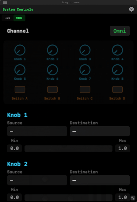 Route destinations for up to eight knobs and four switches to any control on any synth. MIDI control settings are saved per preset. The control grid is fully functional and can double as a live interface for focused manipulation. Select a MIDI source for each control for manipulation from an external MIDI device. Customize range min/max for advanced parameter control.